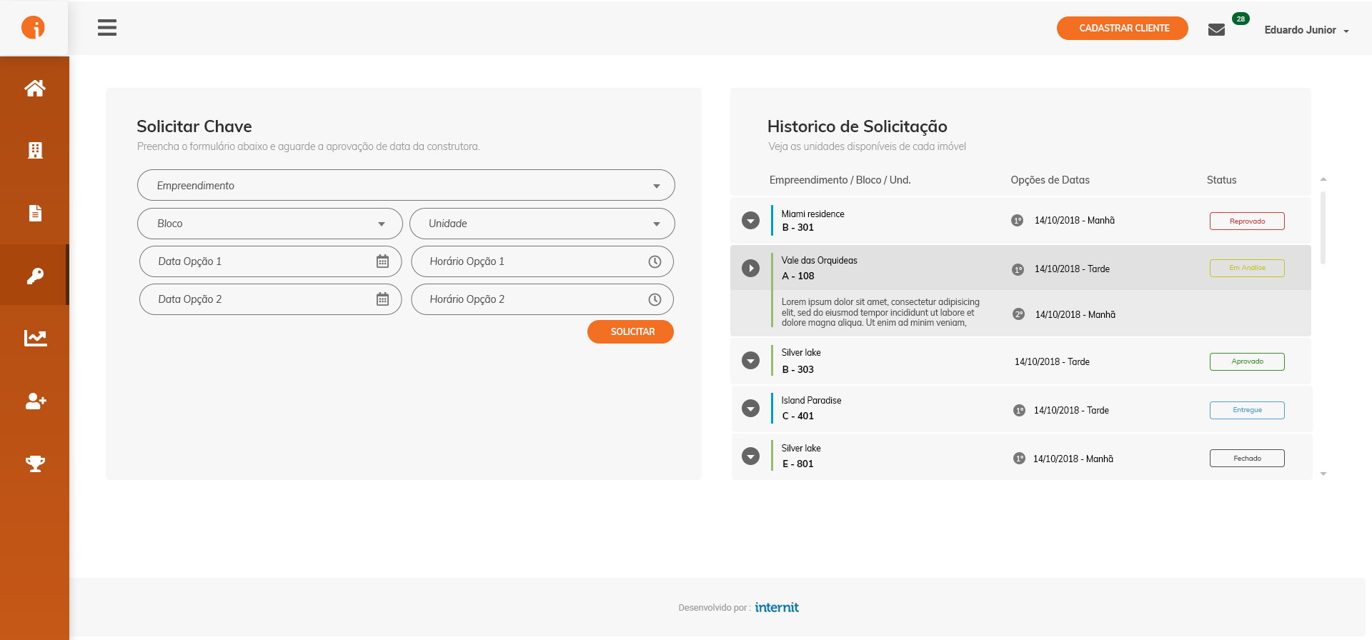 Em nossa plataforma, pedir a chave para ir ao imóvel desejado por um cliente é algo muito simples, com poucos cliques você escolhe a unidade, determina a melhor data e pronto, sua solicitação já foi enviada para a construtora.
