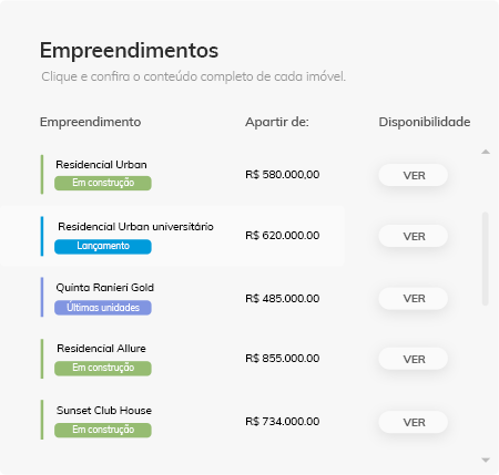 Disponibilidade e preço das unidades em tempo real pelo espelho de vendas e acesso ao conteúdo completo de cada empreendimento, incluindo vídeos, imagens e material para downloads.